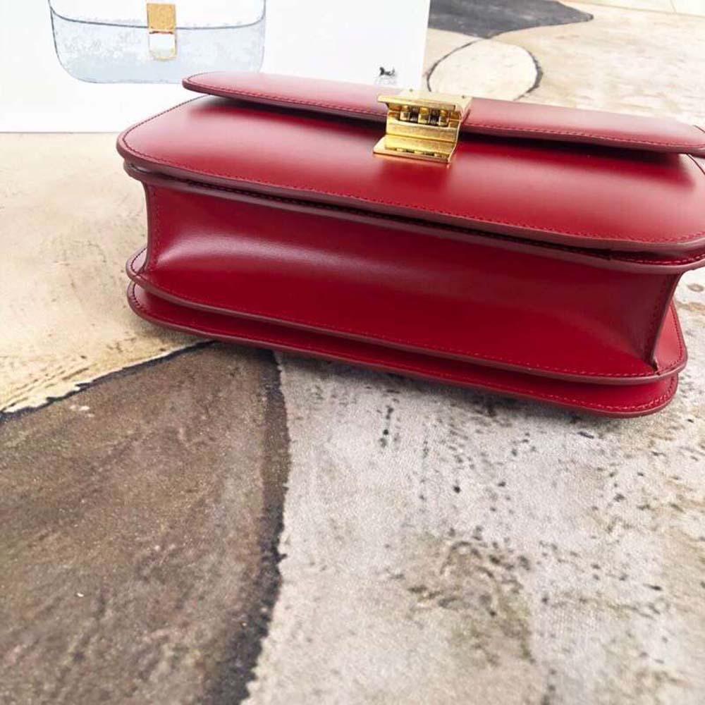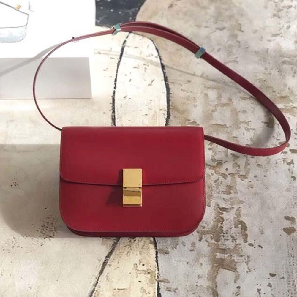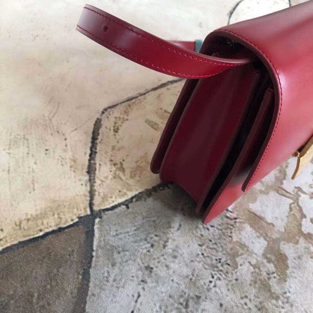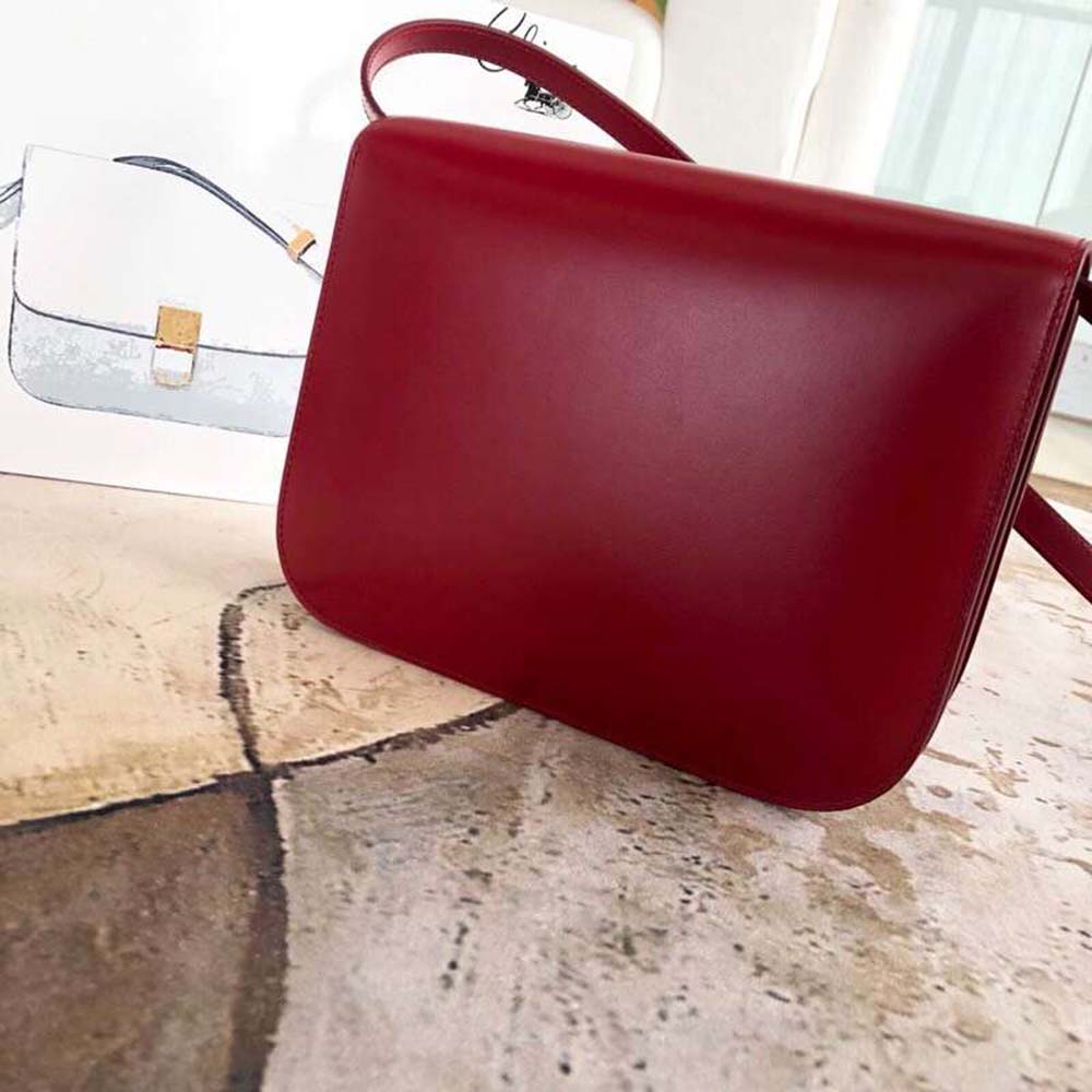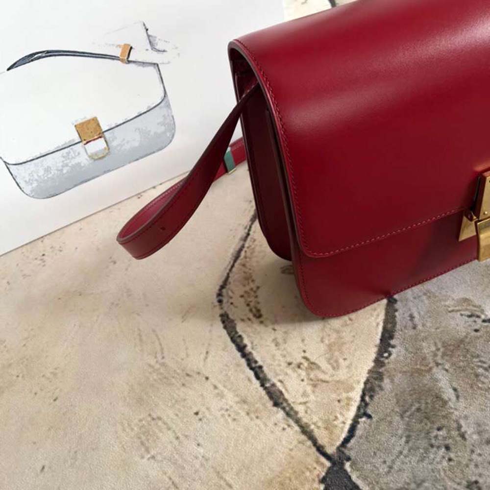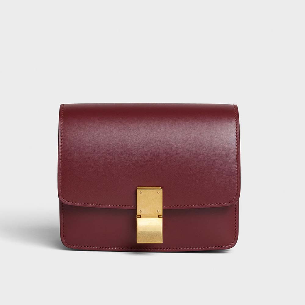 - Small classic bag in box calfskin with an adjustable and removable leather strap and a metallic clasp closure.