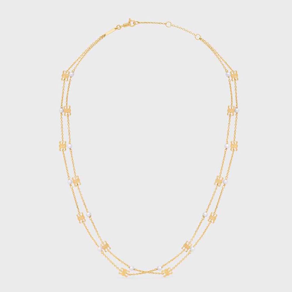 Celine Women Triomphe Pearl Double Necklace in Brass with Gold Finish and Resin Pearls