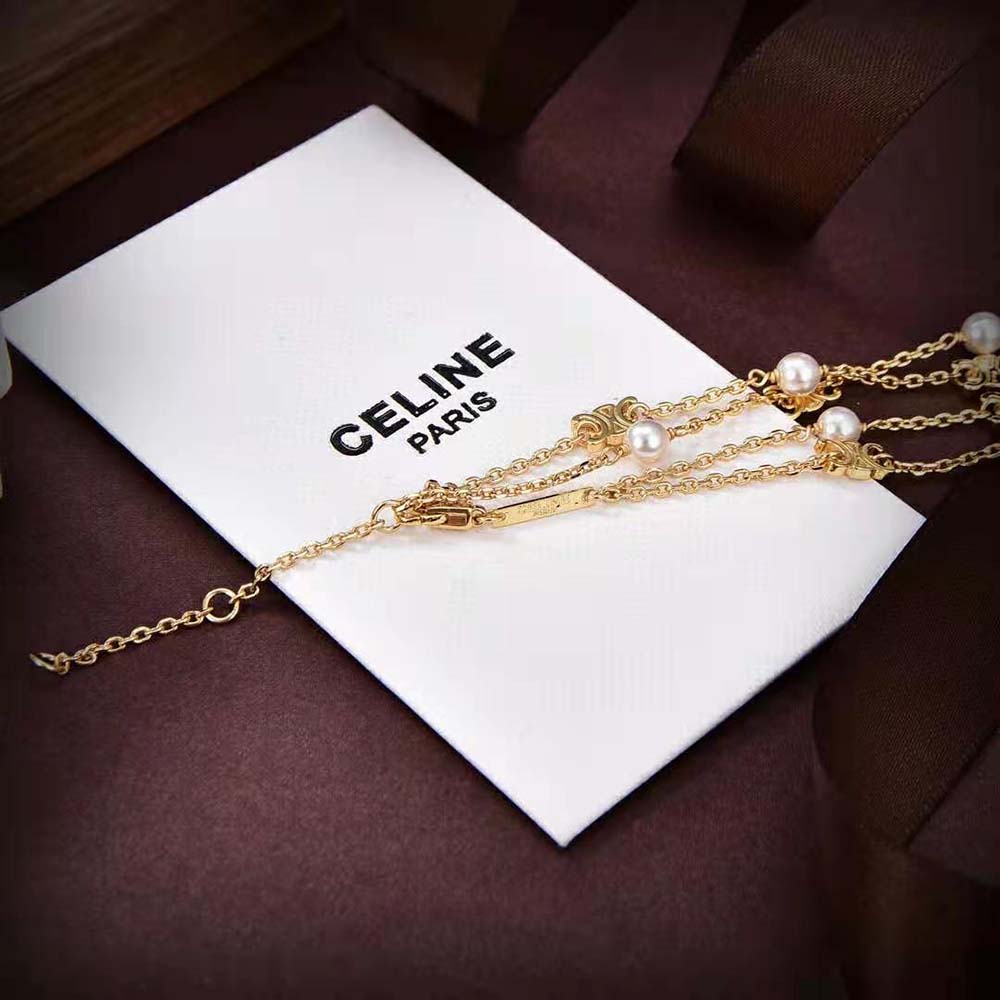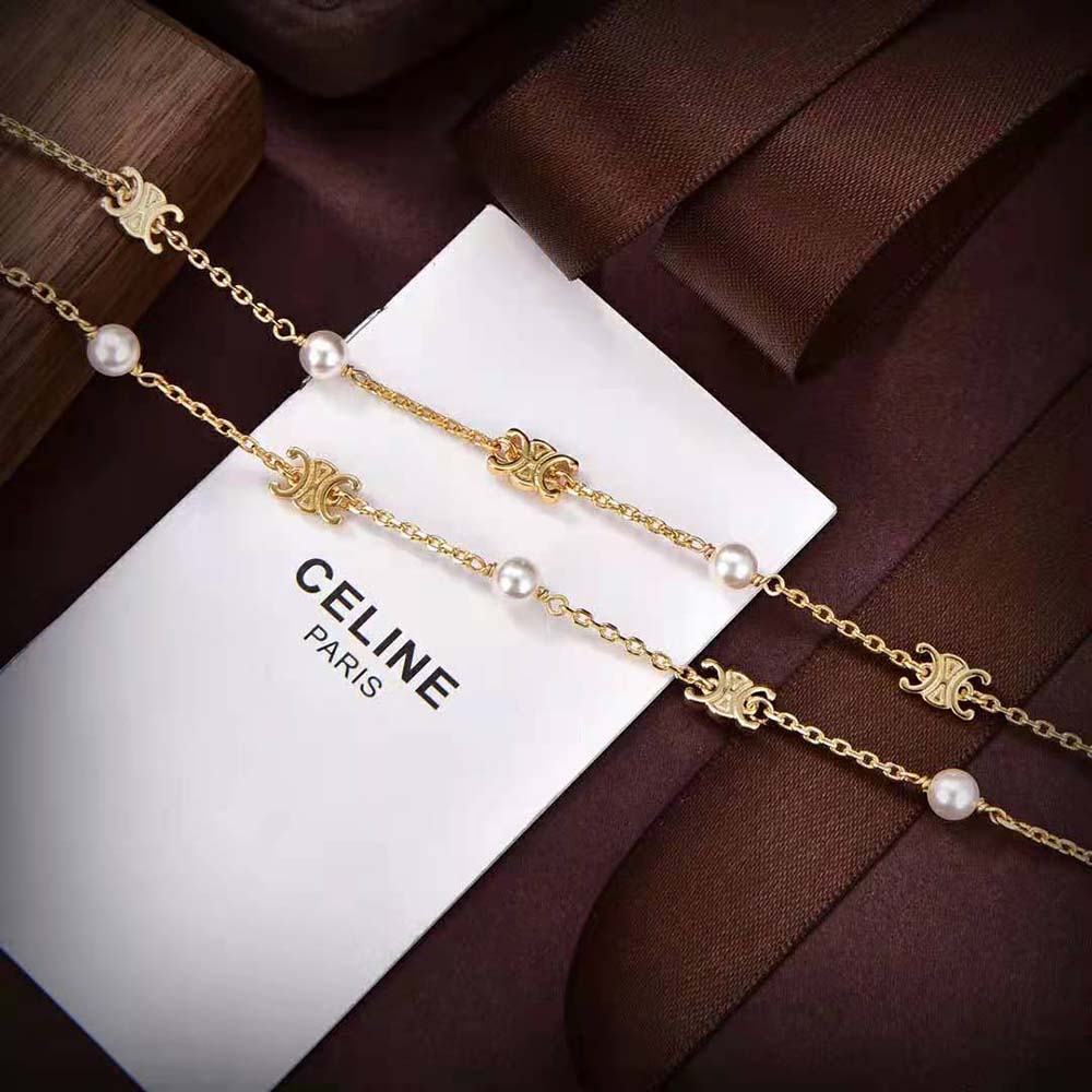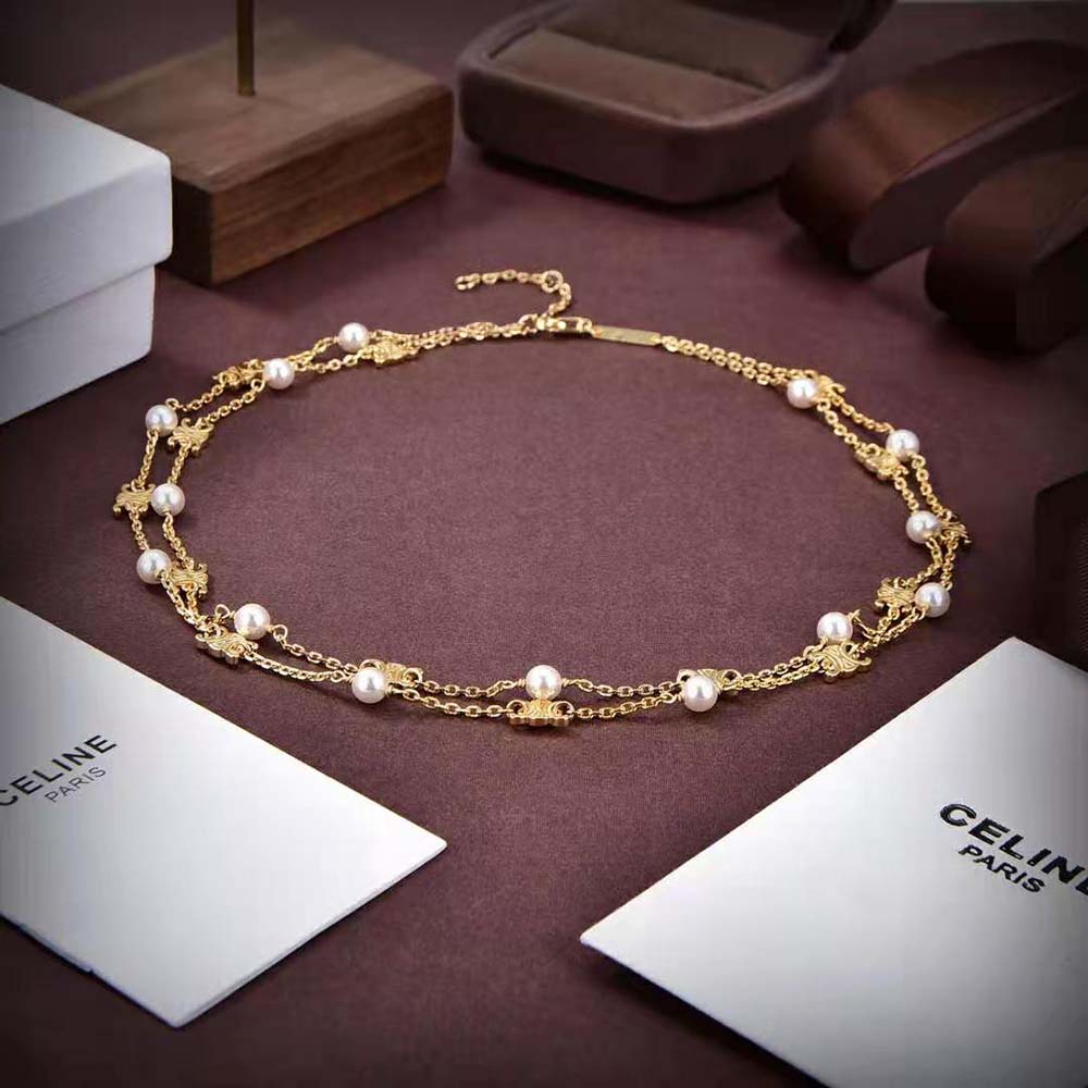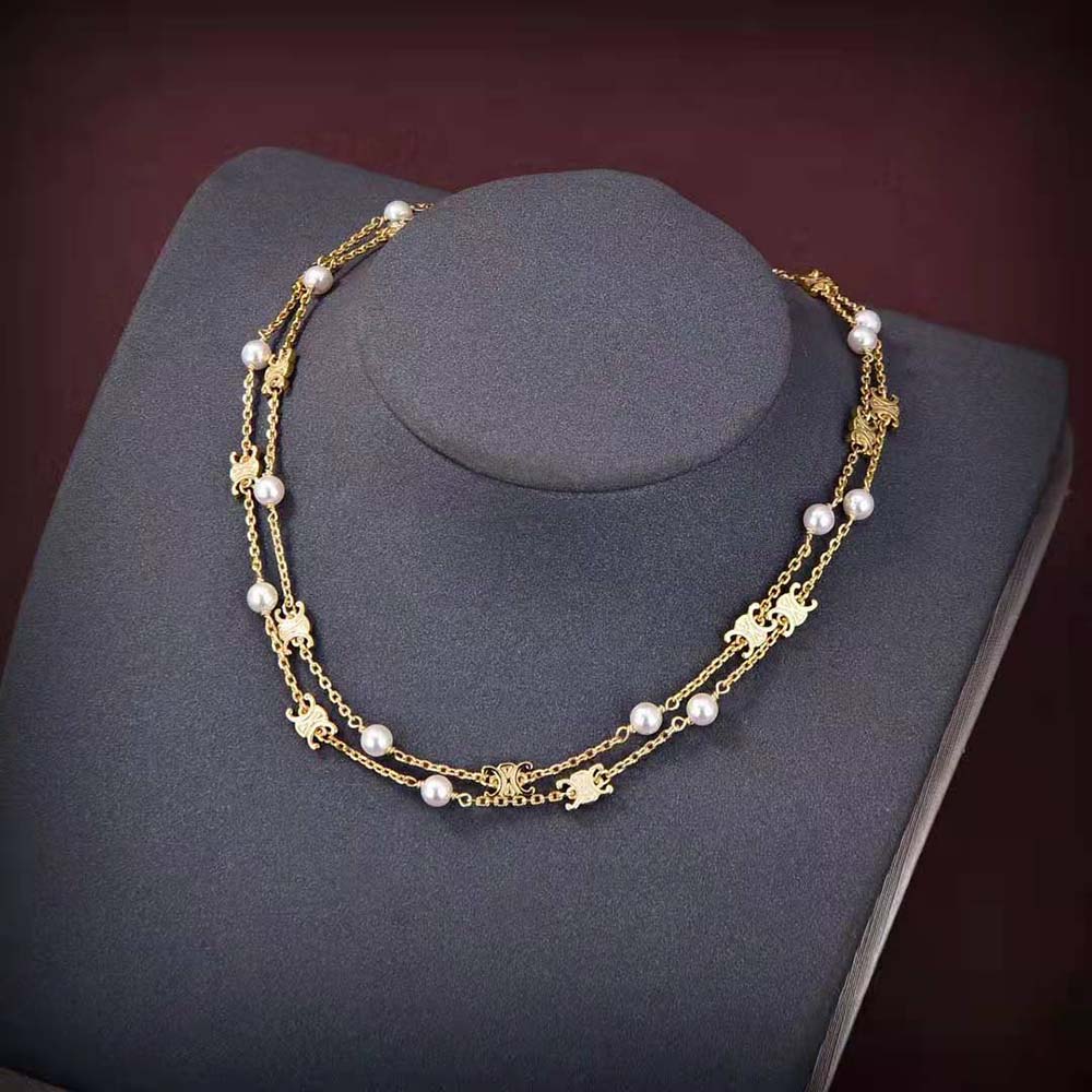 Home Accessories Celine Knockoff Women Triomphe Pearl Double Necklace in Brass with Gold Finish and Resin Pearls