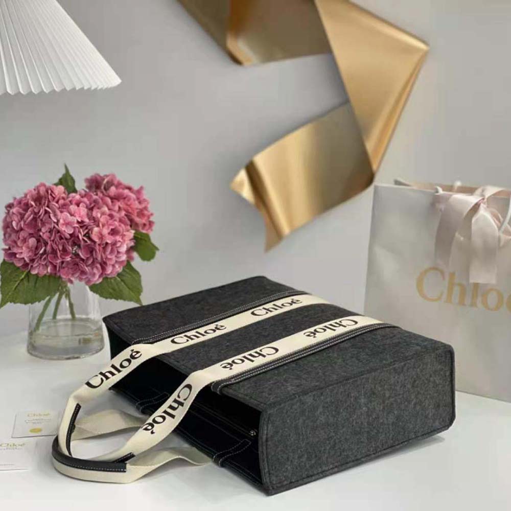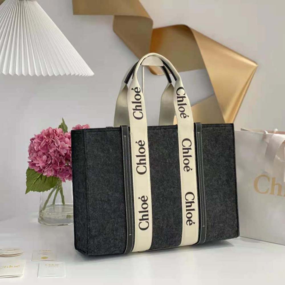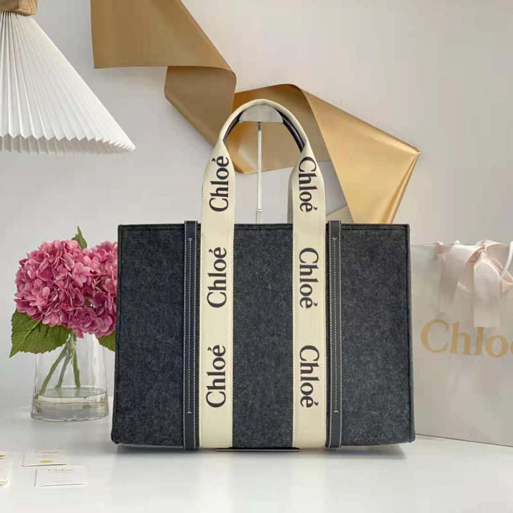 Home Bags & Luggage Handbags Mirror Copy Chloe Women Large Woody Tote Bag in Recycled Felt and Shiny Calfskin-Gray