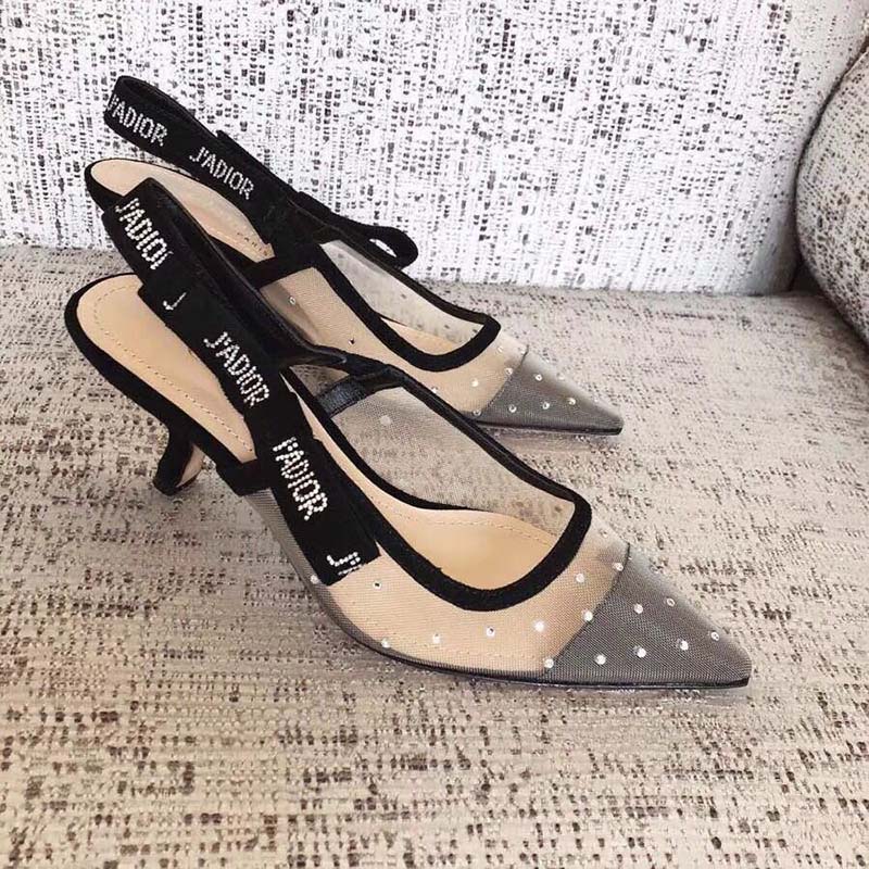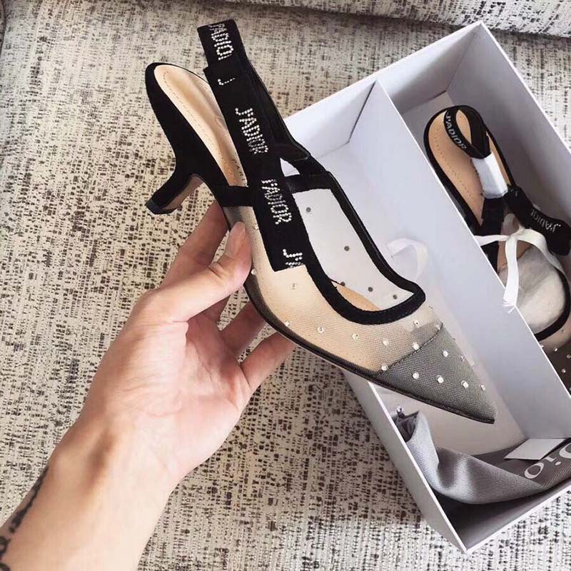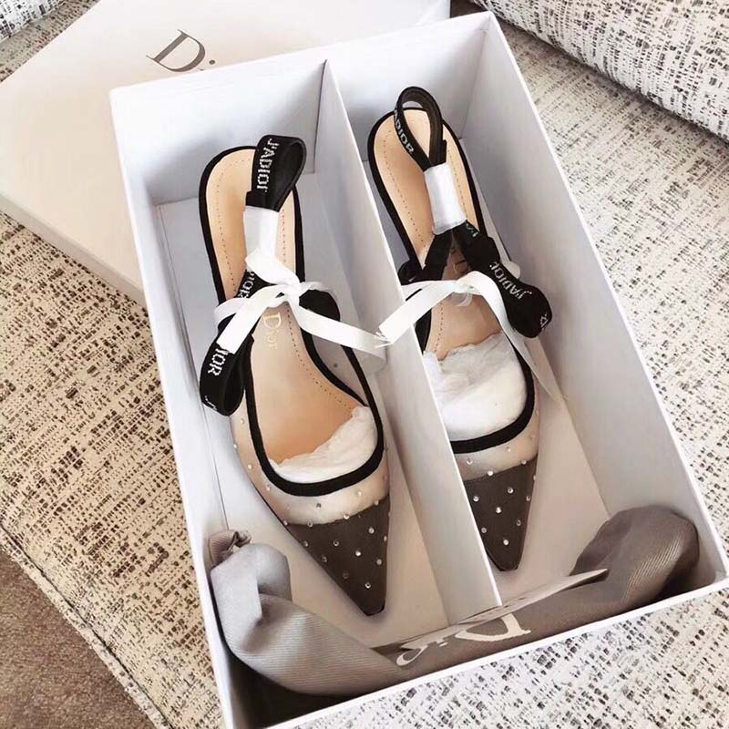 Home Shoes High Heels Dior Replica Women J’Adior Slingback Nude Dotted Swiss Rhinestones Ribbon Adorned Rhinestones
