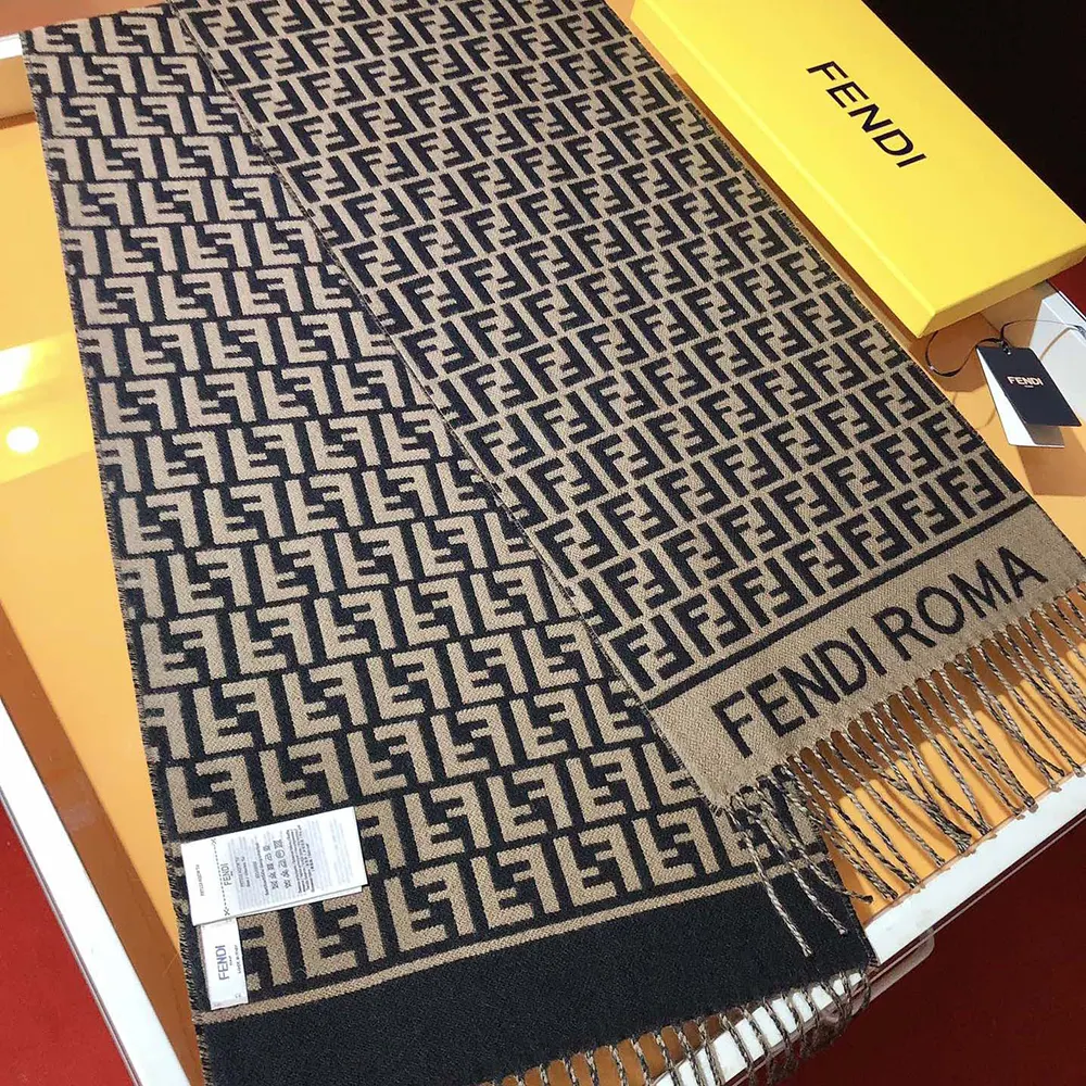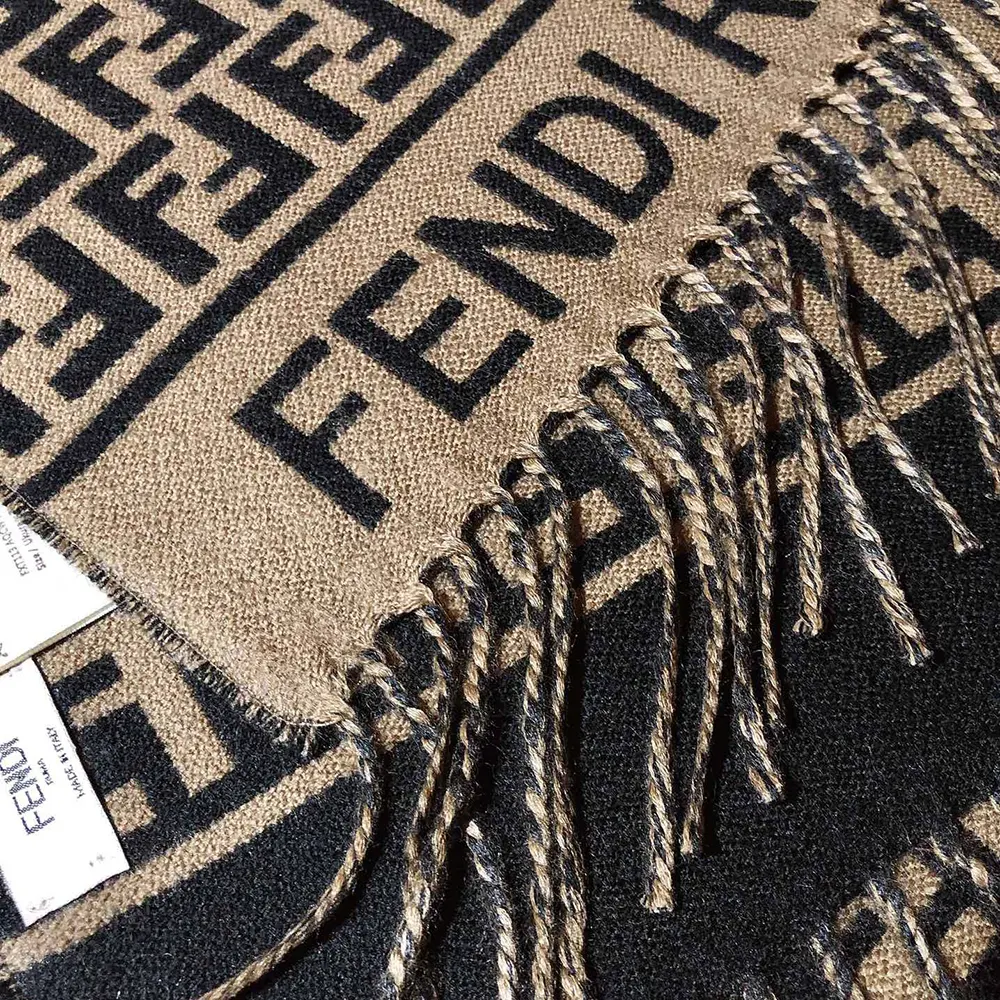 - Scarf made of wool yarn and cashmere with an all-over black and tobacco jacquard FF motif. Embellished