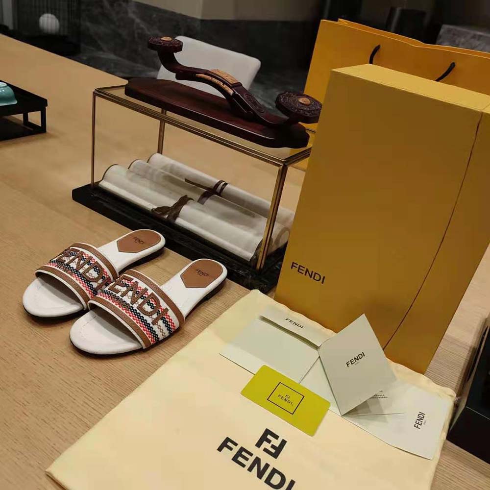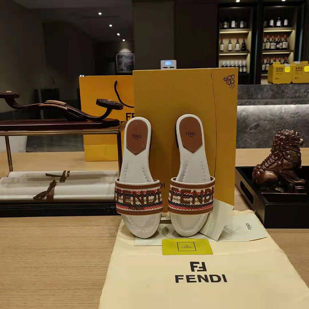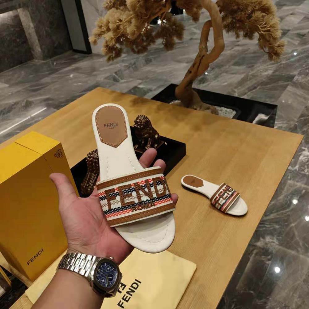 - Wide-band slides. Made of beige canvas with graphic red and blue embroidery.