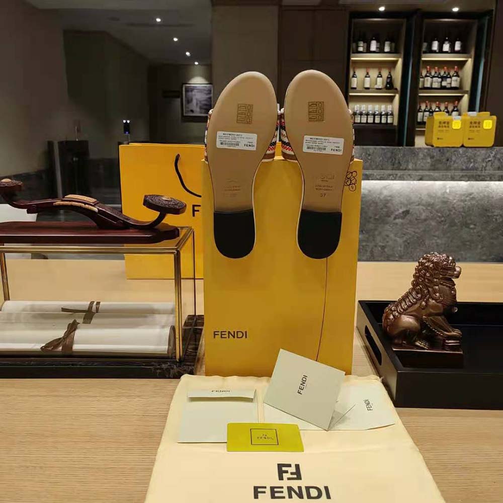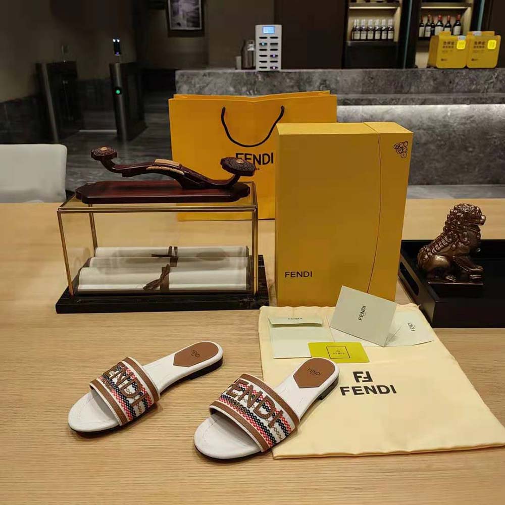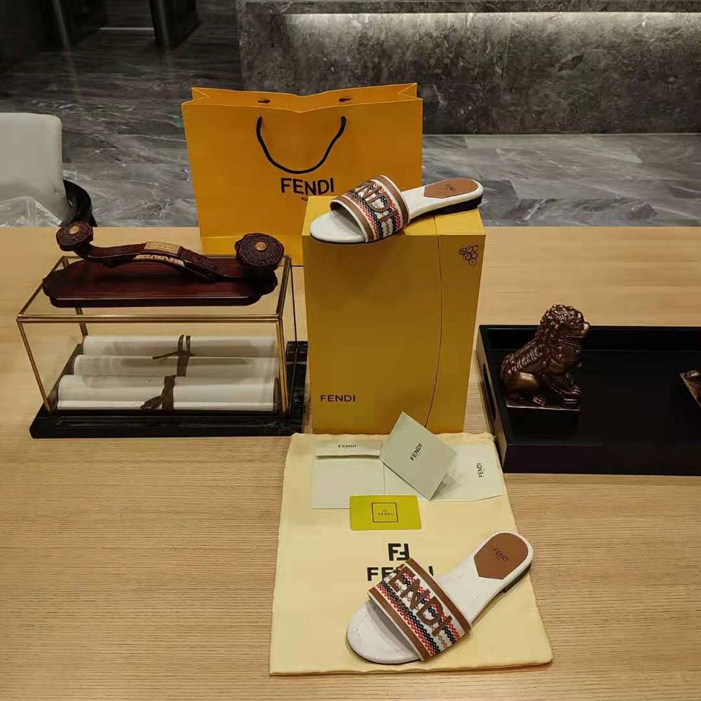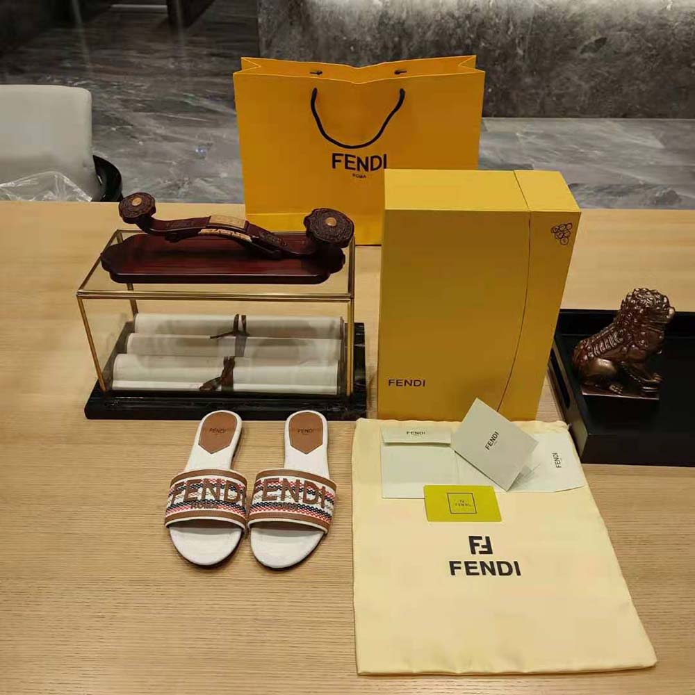 - Wide-band slides. Made of beige canvas with graphic red and blue embroidery.