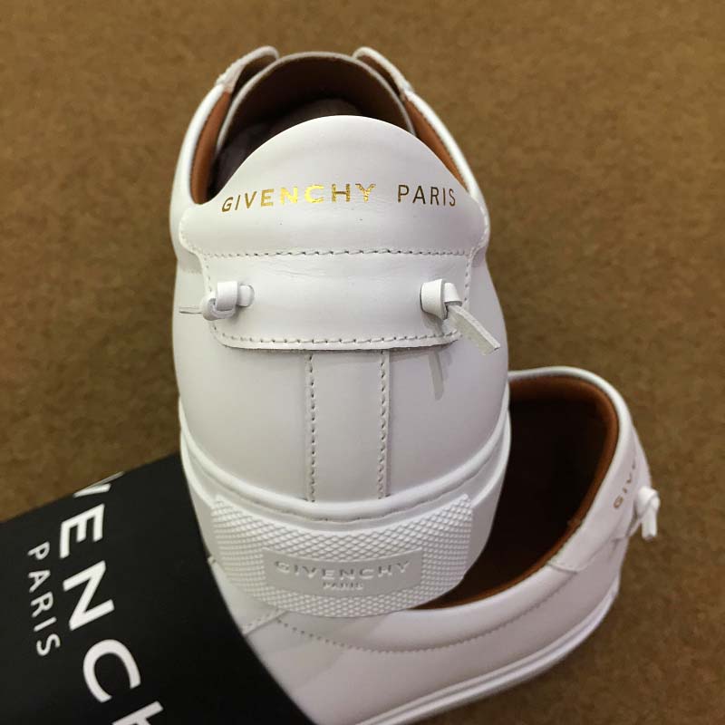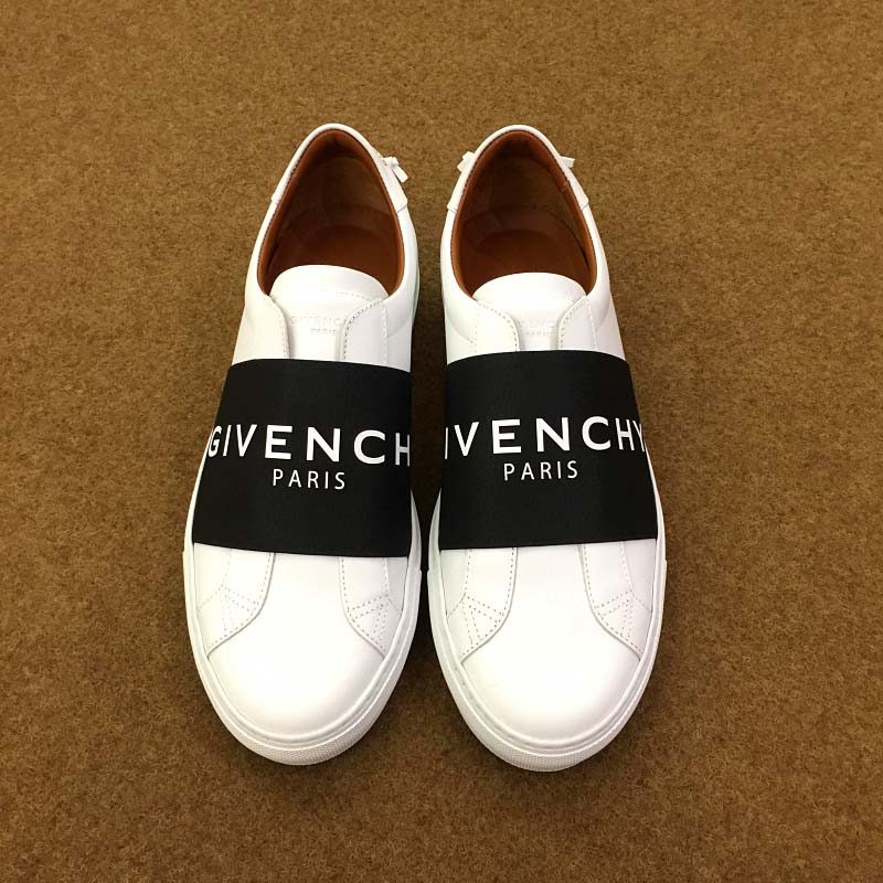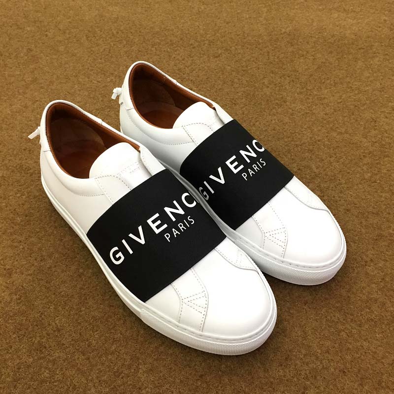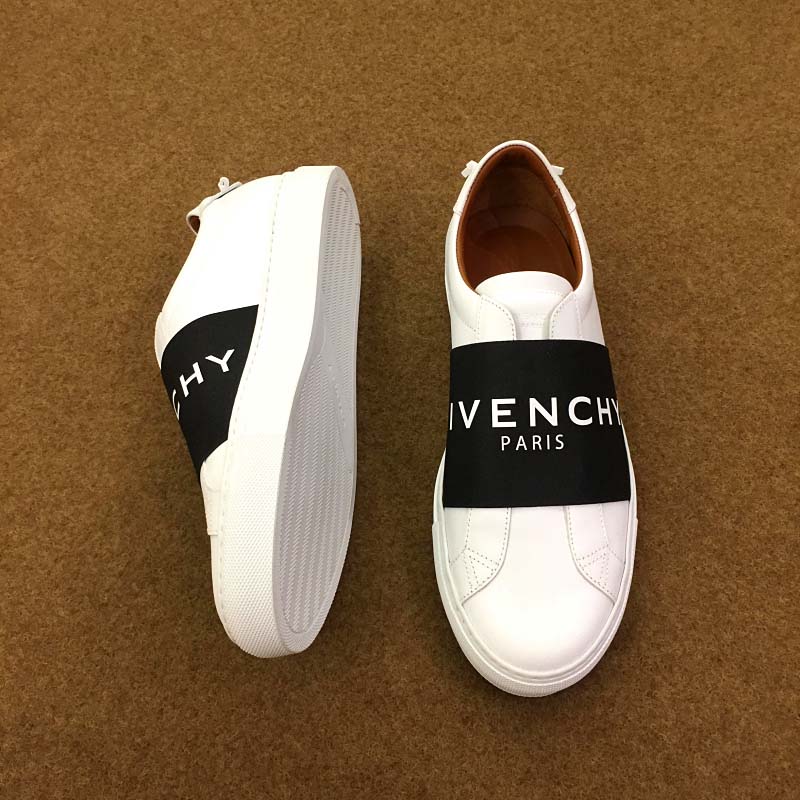 - Matte white leather sneakers overlaid with a wide black GIVENCHY PARIS elastic band.