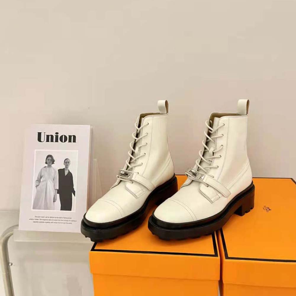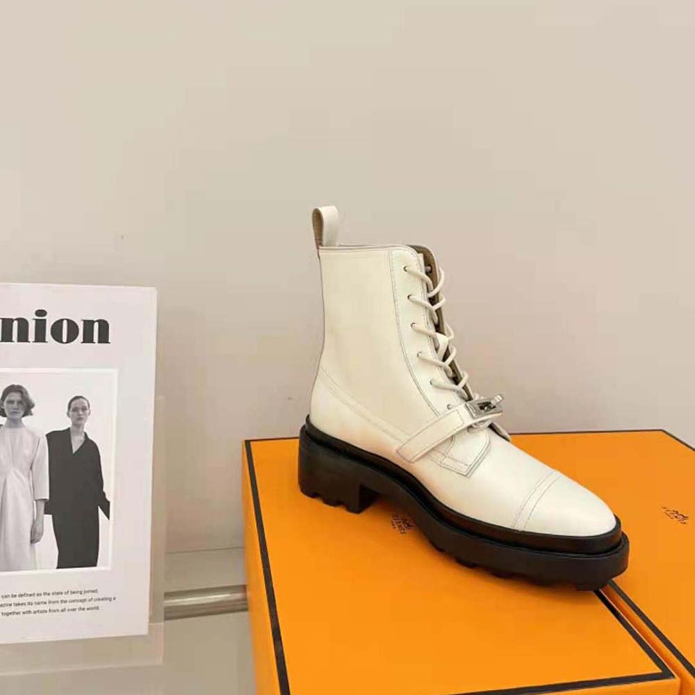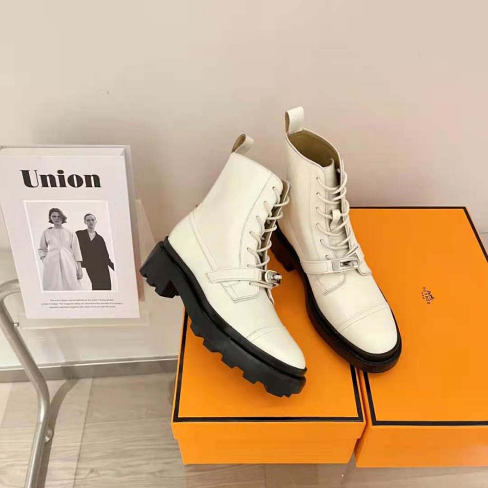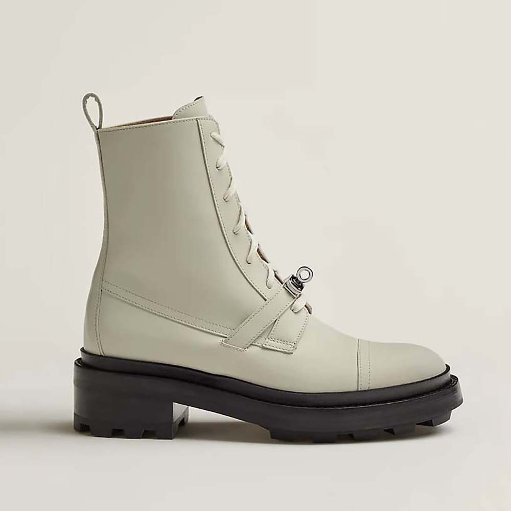 - Ankle boot in calfskin with functional palladium-plated Kelly buckle and chunky sole.