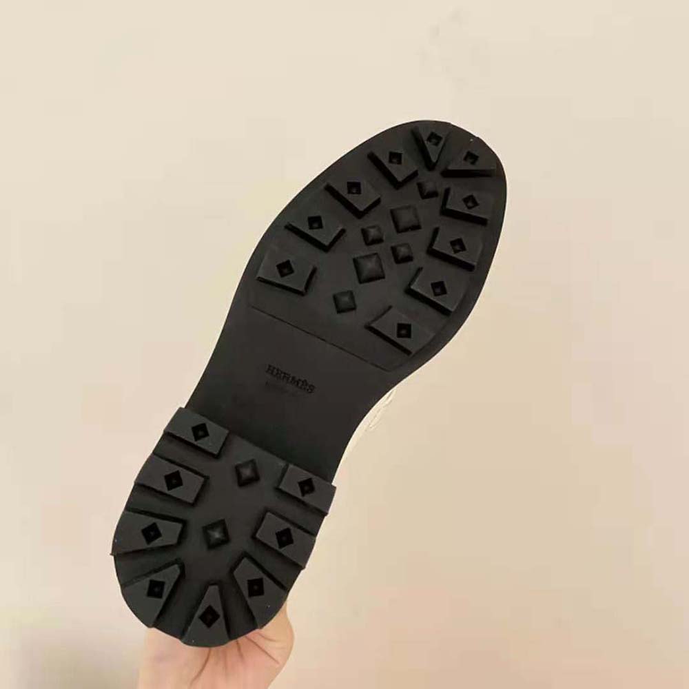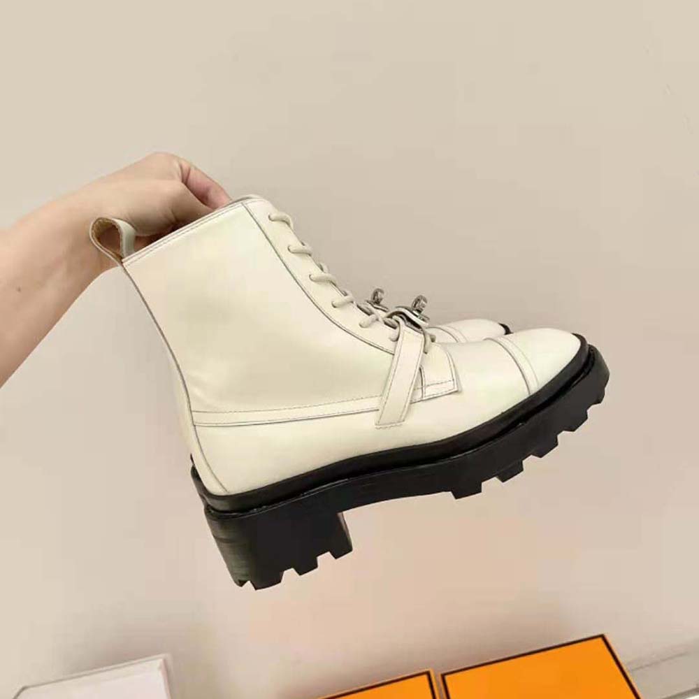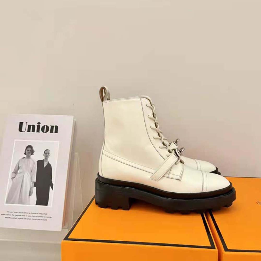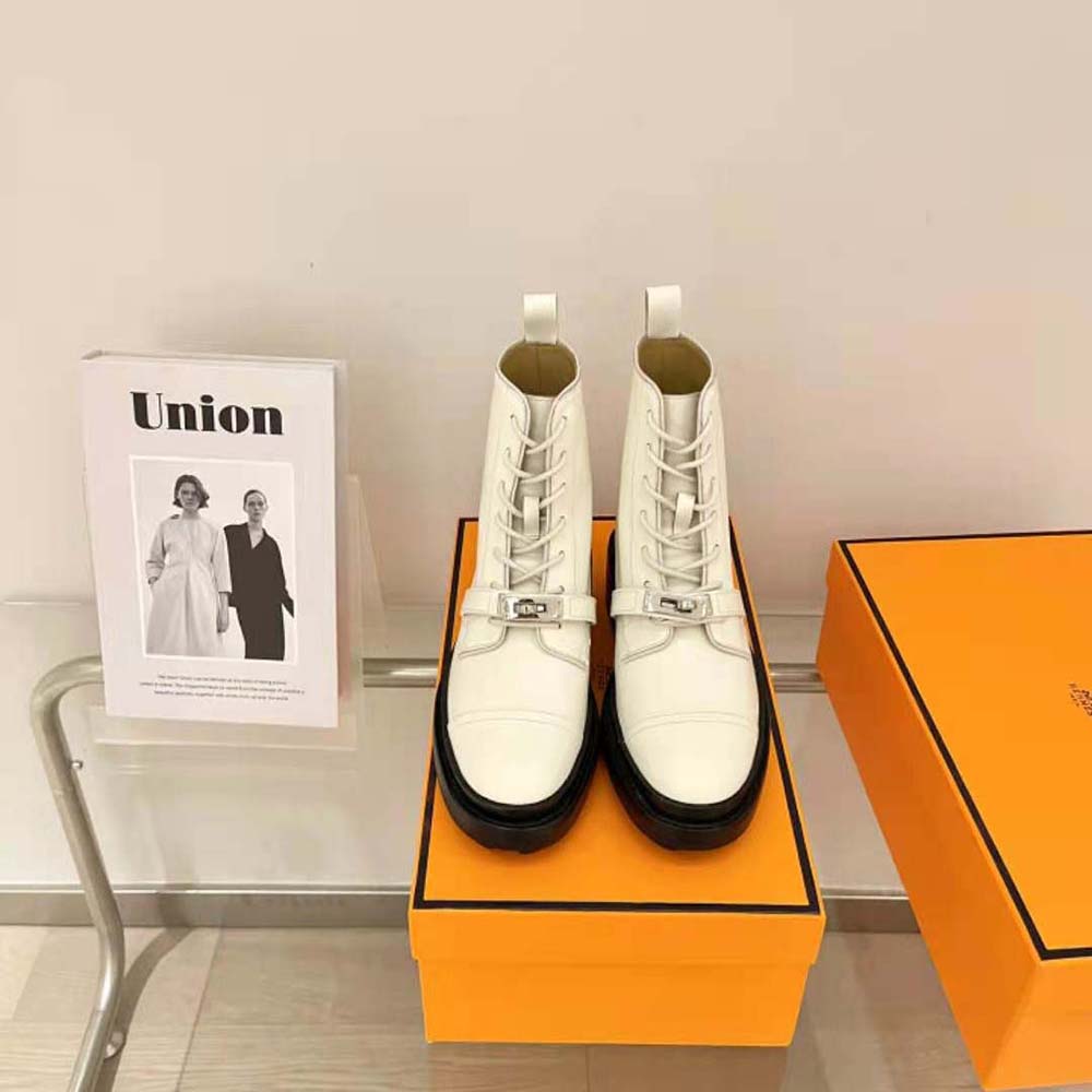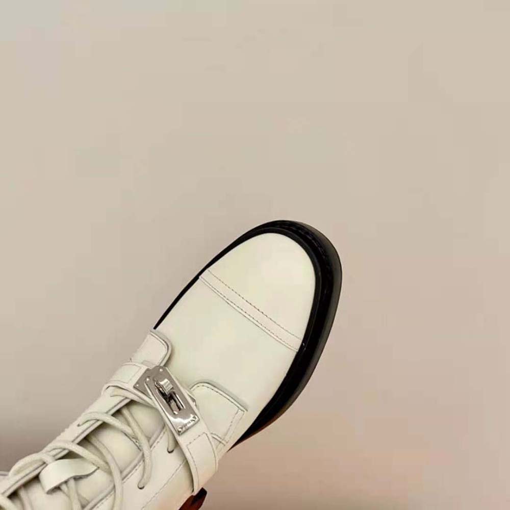 - Ankle boot in calfskin with functional palladium-plated Kelly buckle and chunky sole.