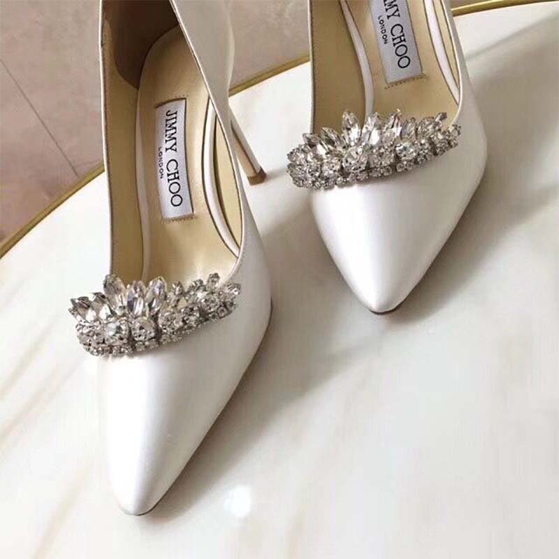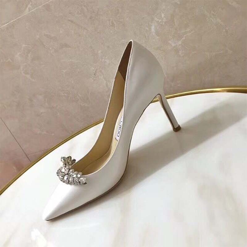 Jimmy Choo Women Shoes Romy 85 Luxury Replica Lvory Satin Pointy Toe Pumps with Crystal Tiara