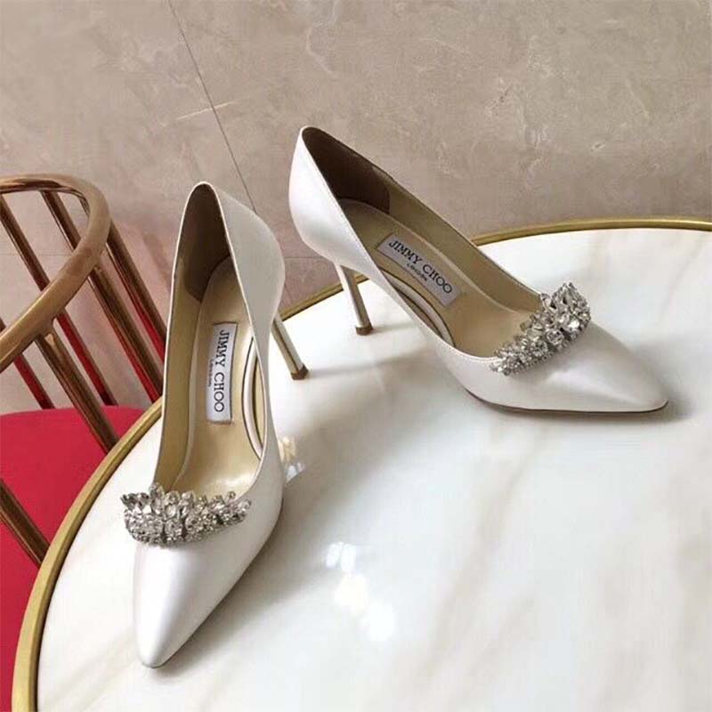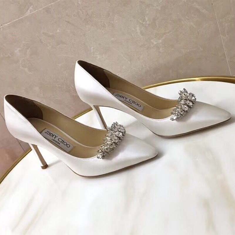 Home Shoes High Heels Jimmy Choo Women Shoes Romy 85 Luxury Replica Lvory Satin Pointy Toe Pumps with Crystal Tiara