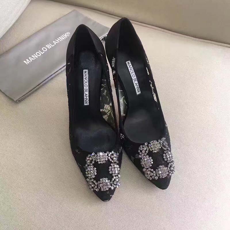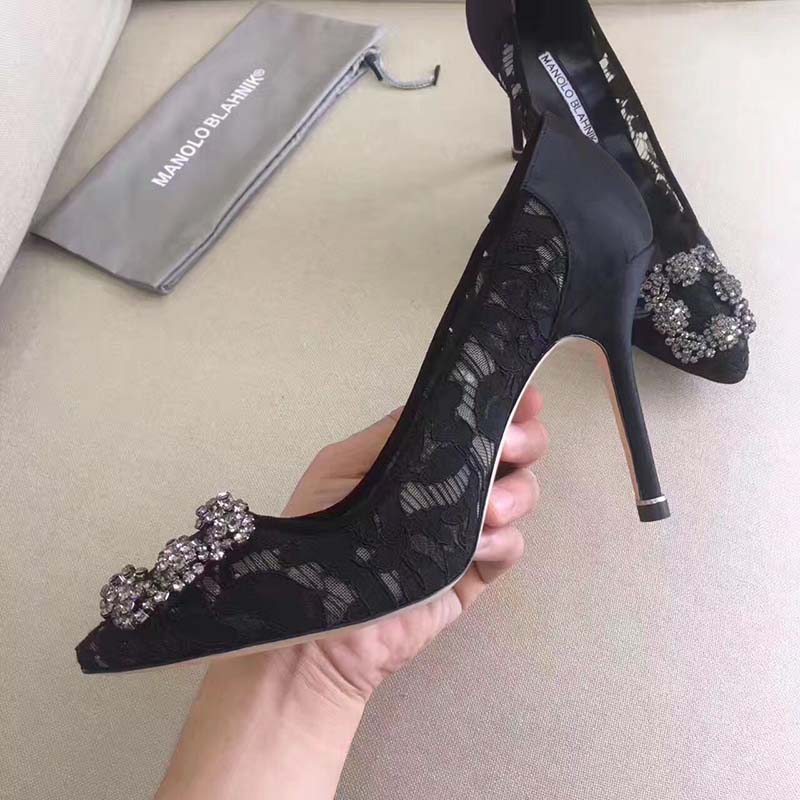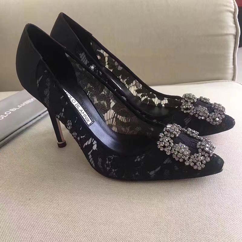 - Black lace toe pumps featuring a Swarovski crystal front buckle and a spin high heel.