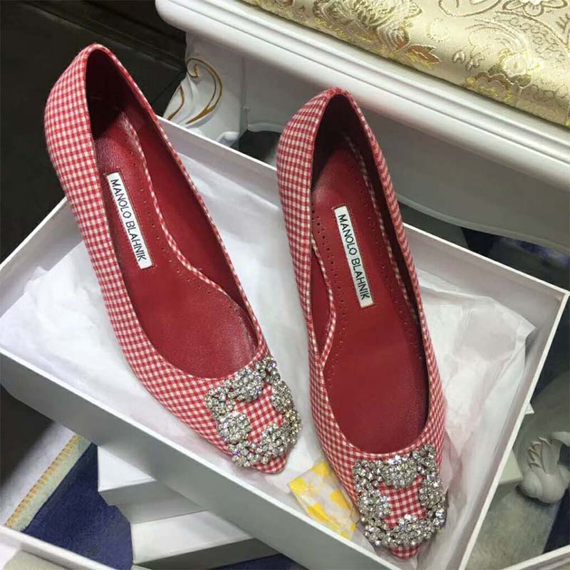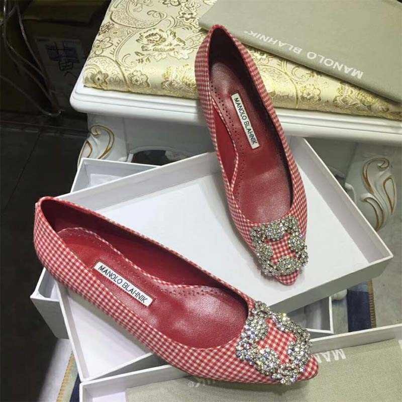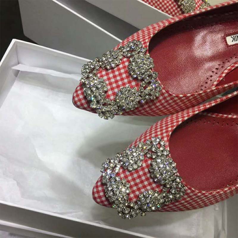 Home Shoes Casual Affordable Replica Manolo Blahnik Women Jewel Buckled Flat Shoes 10mm Heel-Red