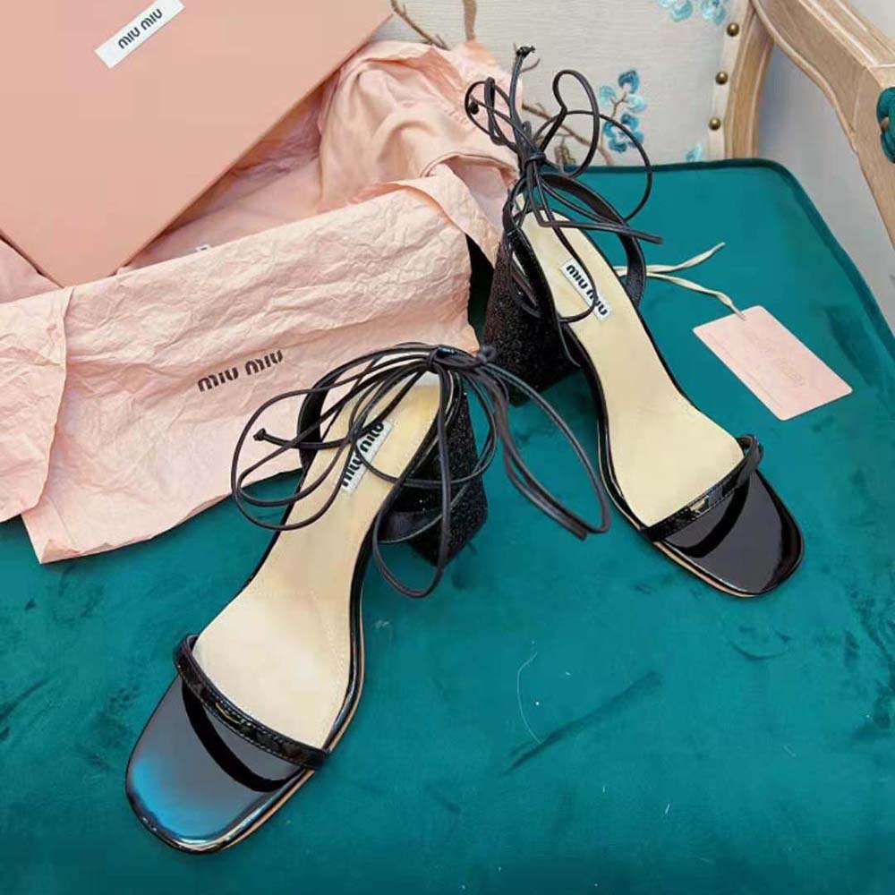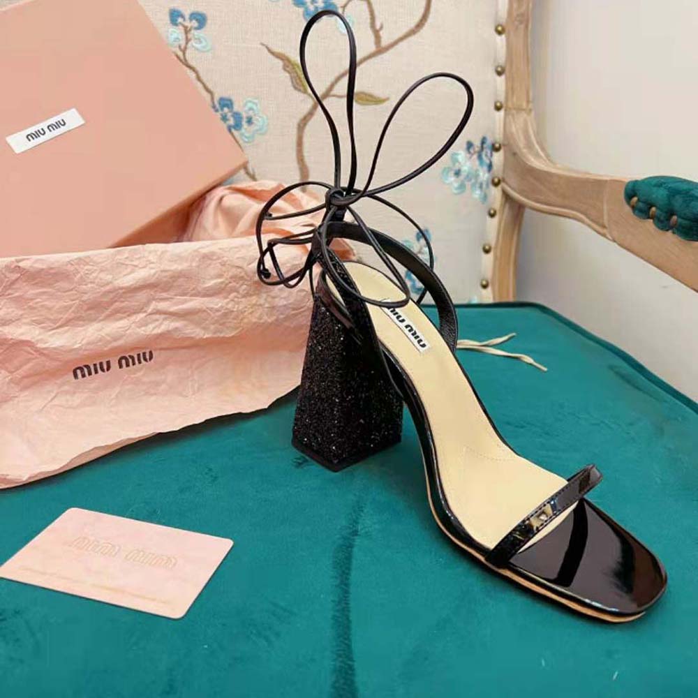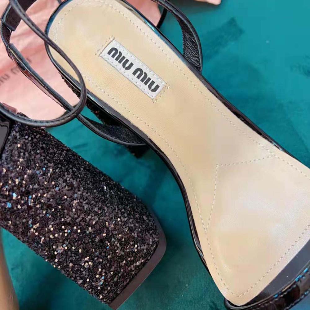 Miu Miu Women Patent Leather and Glitter Sandals in 100mm Heel Height-Black