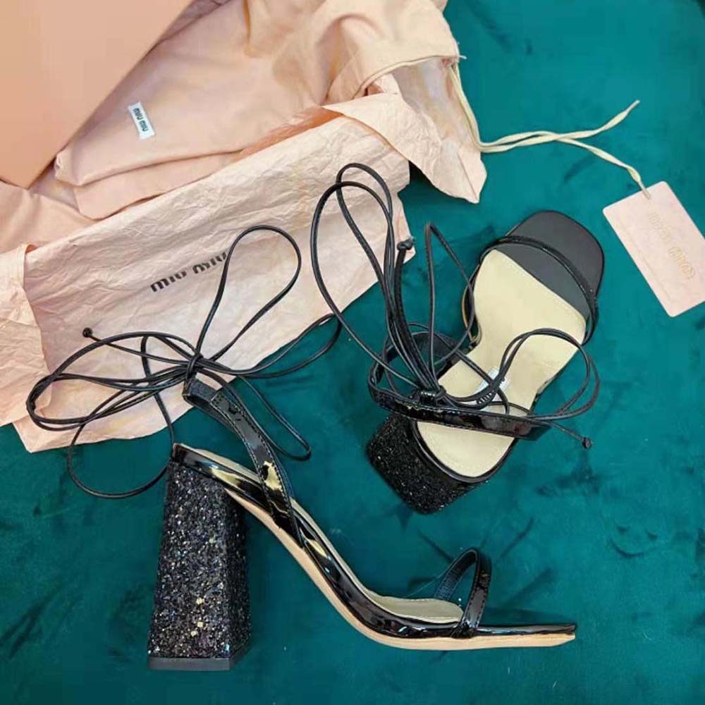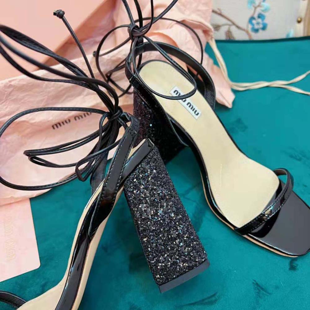 Home Shoes High Heels Miu Miu AAA-grade Fake Women Patent Leather and Glitter Sandals in 100mm Heel Height-Black