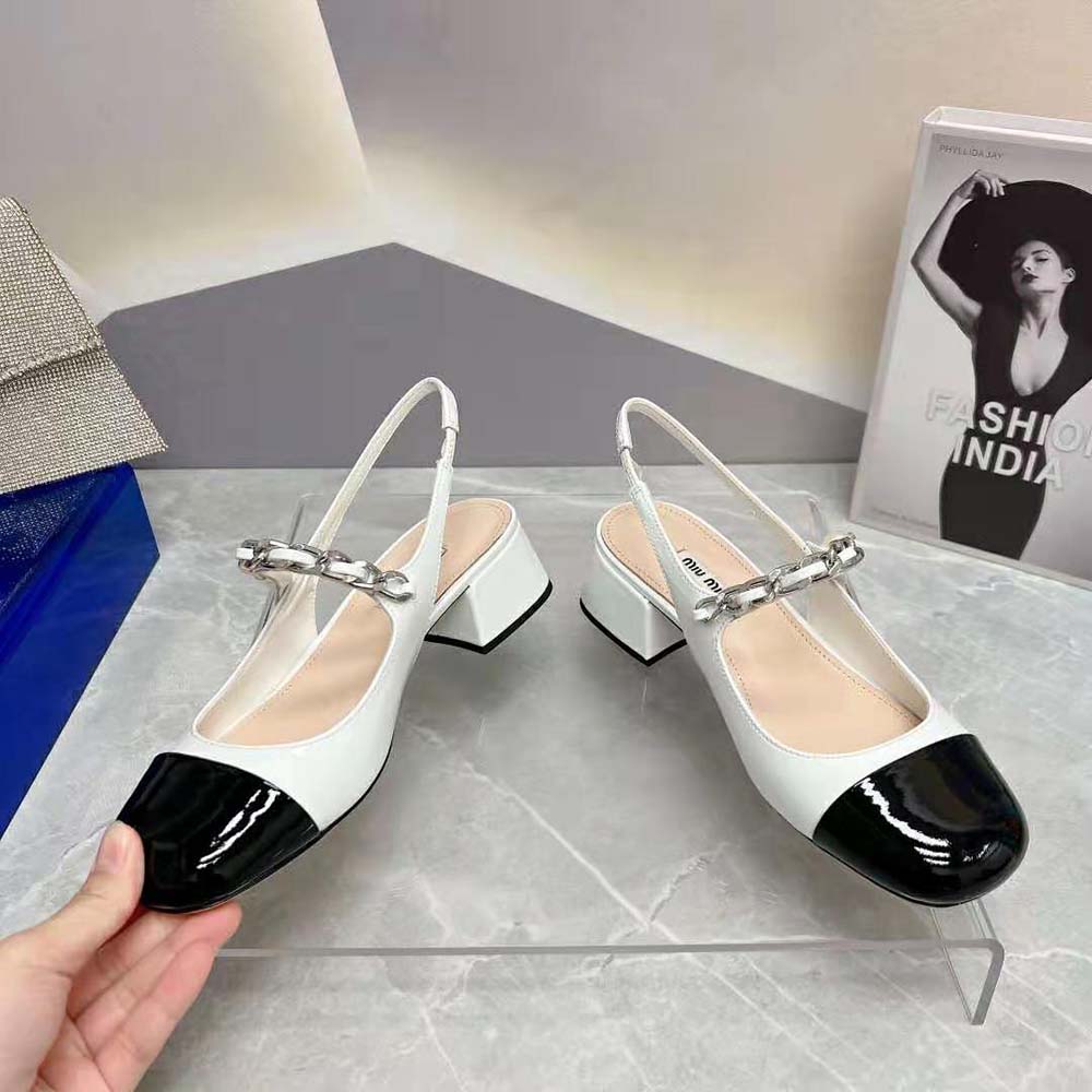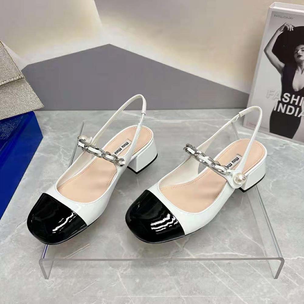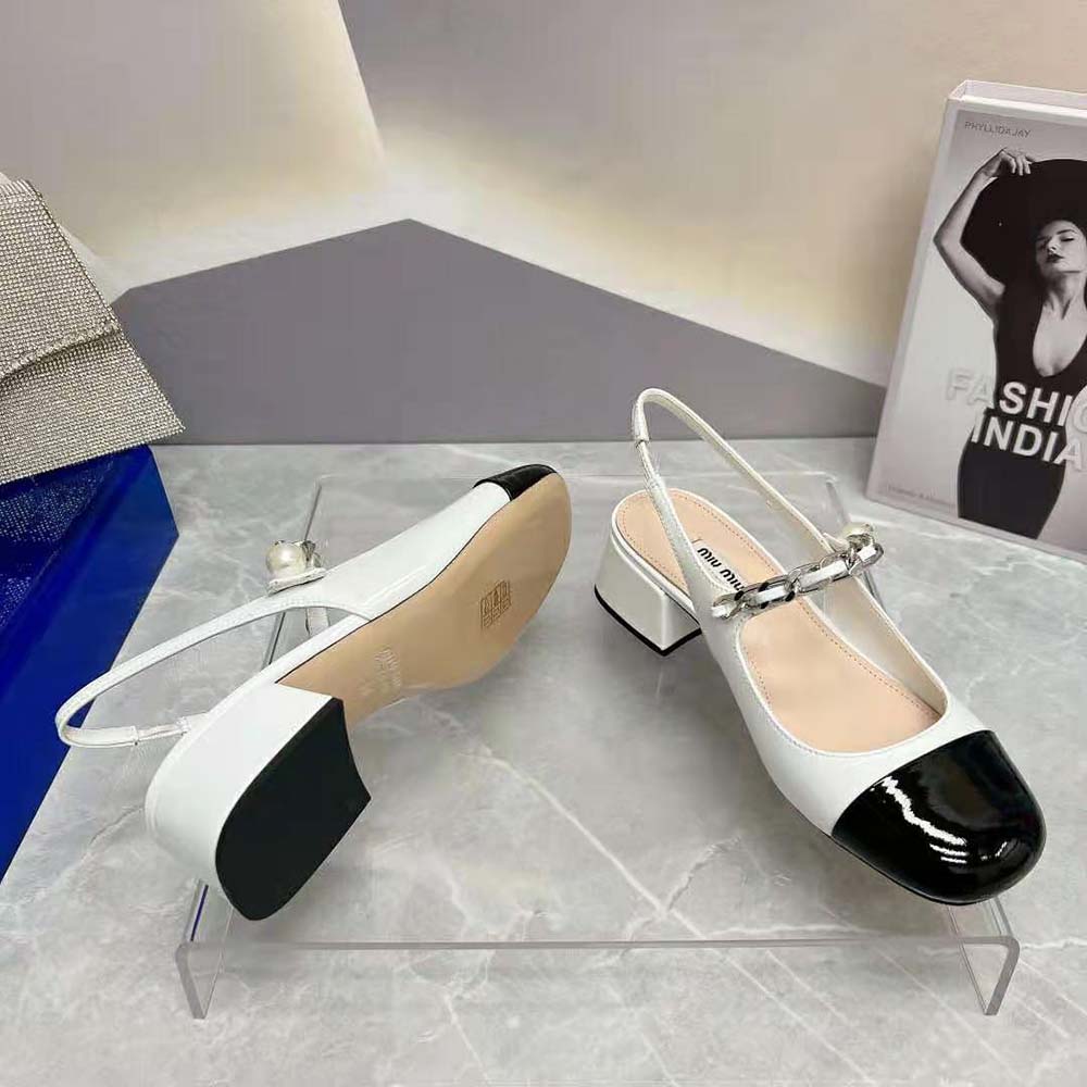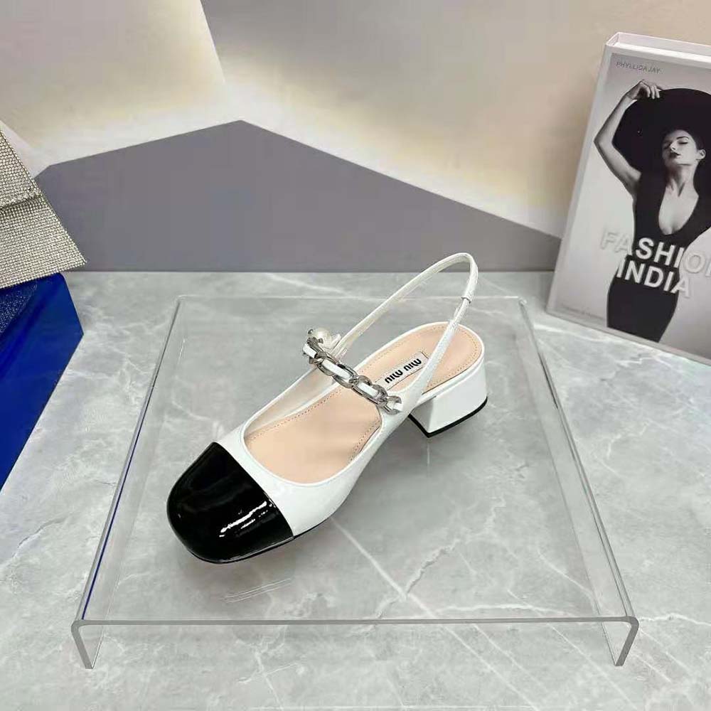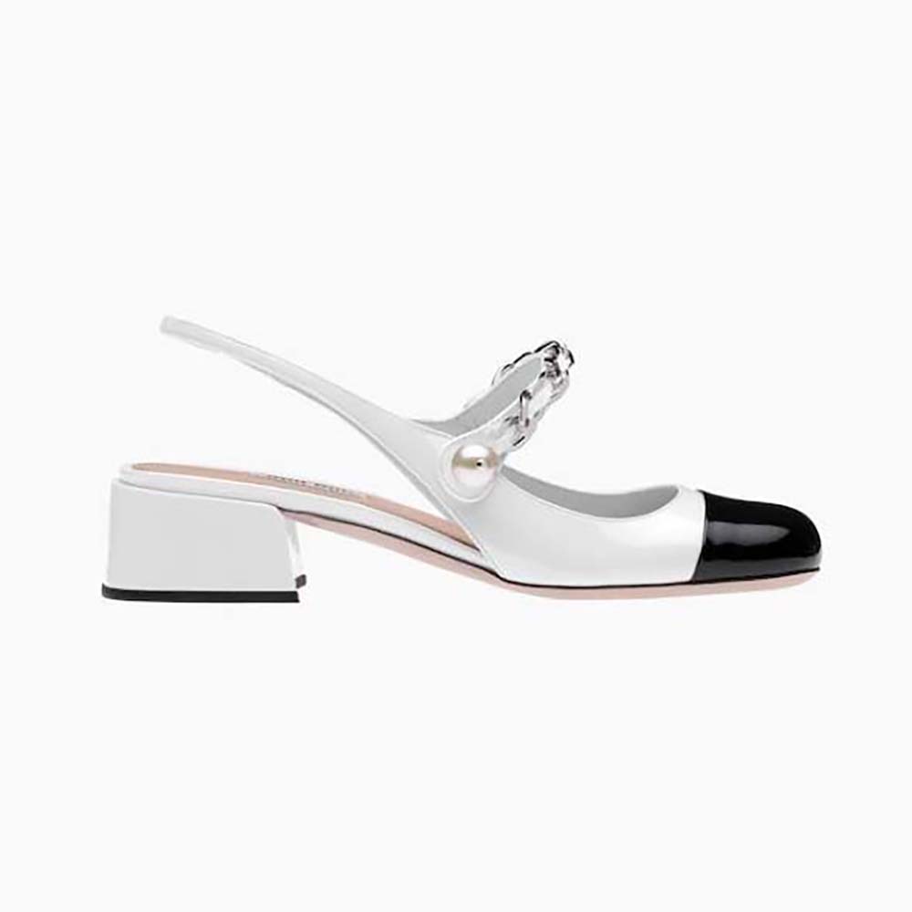 - On these patent leather pumps, the toe in a contrasting shade and instep strap add romantic charm.