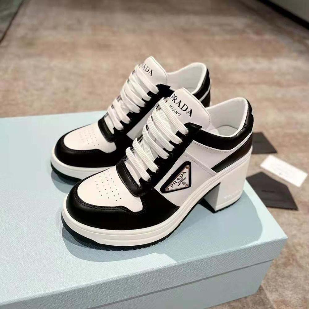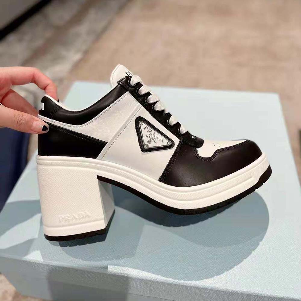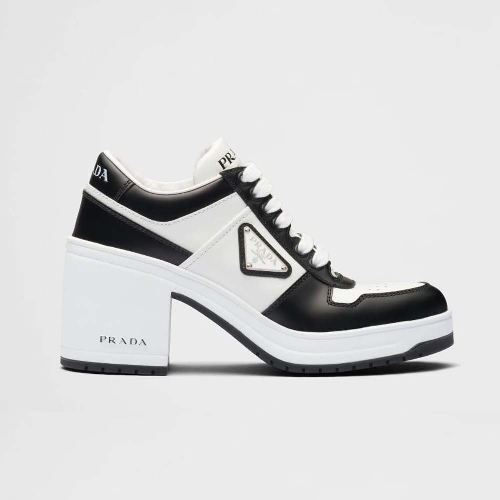 - These sporty leather sneakers are enhanced by the high heel for an unexpected twist.