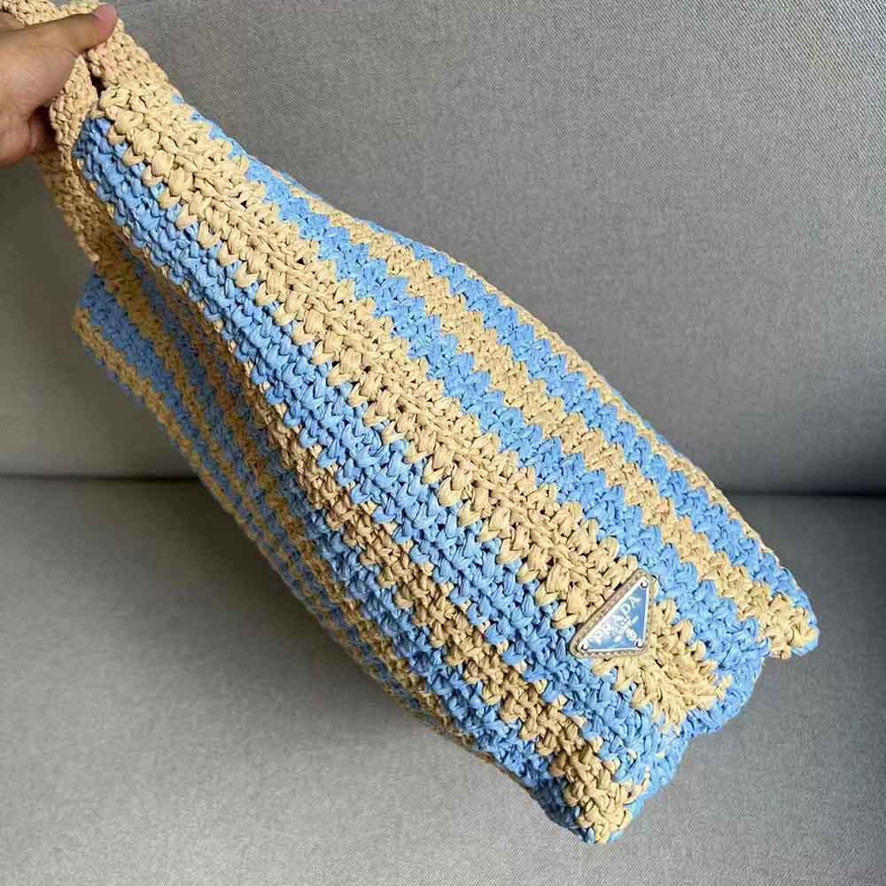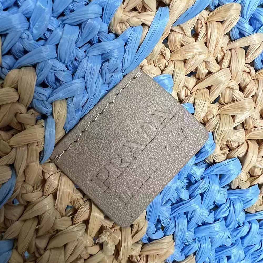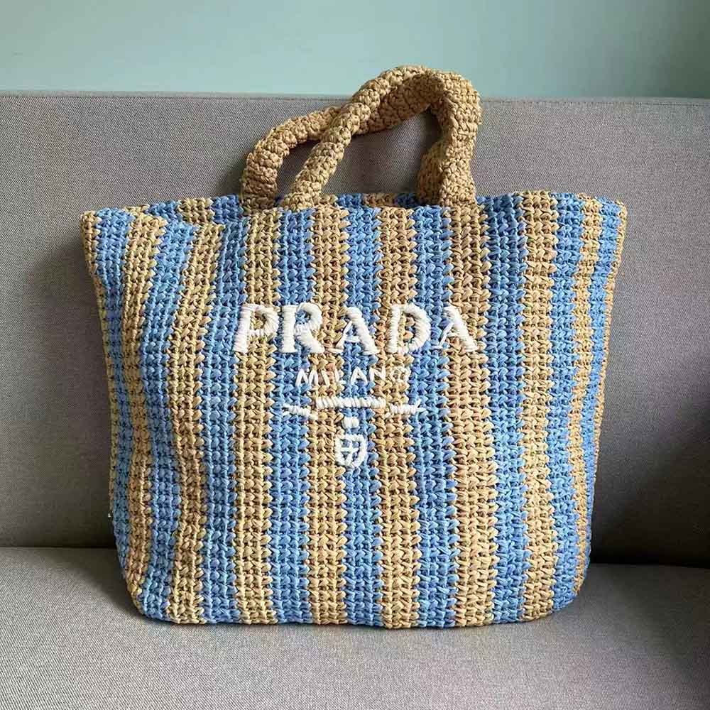 Prada Women Large Raffia Tote Bag with Embroidered Lettering Logo on the Front-Blue