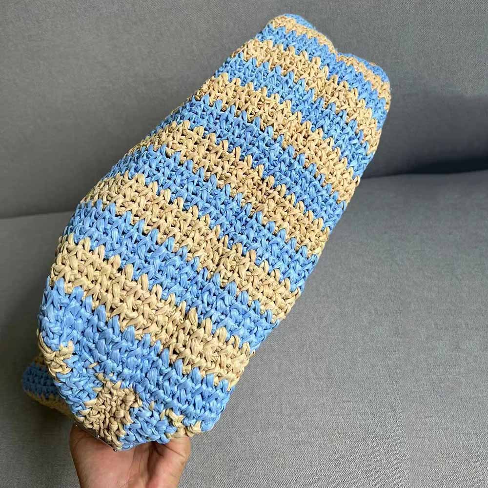 Prada Imitation Women Large Raffia Tote Bag with Embroidered Lettering Logo on the Front-Blue